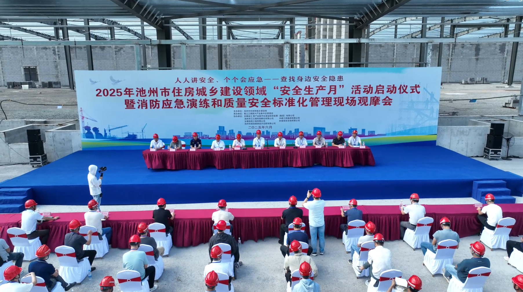 近日,《2025年池州市住房城鄉(xiāng)建設(shè)領(lǐng)域“安全生產(chǎn)月”活動啟動儀式暨消防應(yīng)急演練和質(zhì)量安全標準化管理現(xiàn)場觀摩會》在集團所屬地質(zhì)公司承建的“京東云倉EPC項目”現(xiàn)場隆重舉行。副市長胡軍保、集中區(qū)管委會副主任張平、市住建局局長付四九及三縣一區(qū)住建安全部門和企業(yè)代表共同參與此次活動。