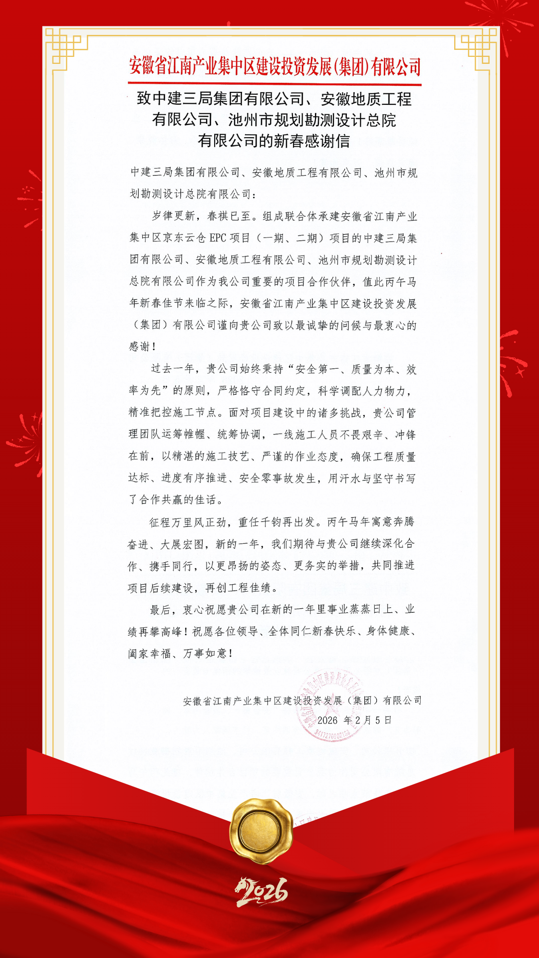 歲末傳捷報(bào),新春啟佳音。近日,由集團(tuán)旗下安徽地質(zhì)工程有限公司、池州市規(guī)劃勘測設(shè)計(jì)總院有限公司與中建三局集團(tuán)有限公司組成的聯(lián)合體,在安徽省江南產(chǎn)業(yè)集中區(qū)京東云倉EPC項(xiàng)目(一期、二期)建設(shè)中,以“安全零事故、質(zhì)量全達(dá)標(biāo)、進(jìn)度穩(wěn)推進(jìn)”的優(yōu)異成績,圓滿達(dá)成年度建設(shè)目標(biāo),贏得項(xiàng)目業(yè)主安徽省江南產(chǎn)業(yè)集中區(qū)建設(shè)投資發(fā)展(集團(tuán))有限公司的高度認(rèn)可與新春致謝。